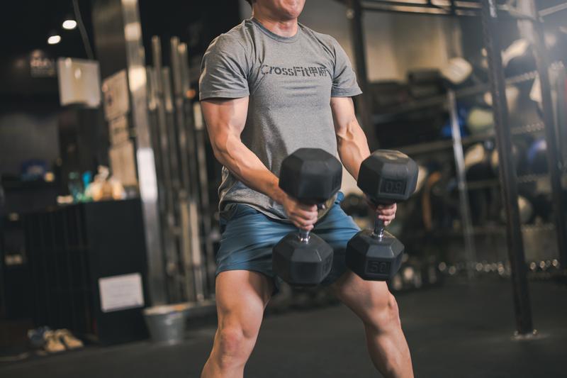- 両手にダンベルを持ち、手のひらを向かい合わせにする